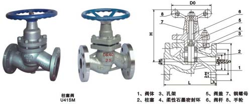 U41H法蘭式柱塞閥是由閥體、閥蓋、閥桿、柱塞、孔架、密環(huán)、手輪等零件組成(如圖)。當(dāng)手輪旋轉(zhuǎn)時,通過閥桿帶動柱塞在孔架中間上下往復(fù)運動來完成閥門的開啟與關(guān)閉功能。由于密封圈采用新型非金屬材料制成,具有經(jīng)受長期高溫、高壓而不喪失彈性的性能,而且柱塞與密封圈之間的接觸面積大,再者,密封圈系混合材料性能好,因此,密封可靠,經(jīng)久耐用。主要適用于冶金、電業(yè)、化工、煉油、化肥、輕工、食品等行業(yè)中。